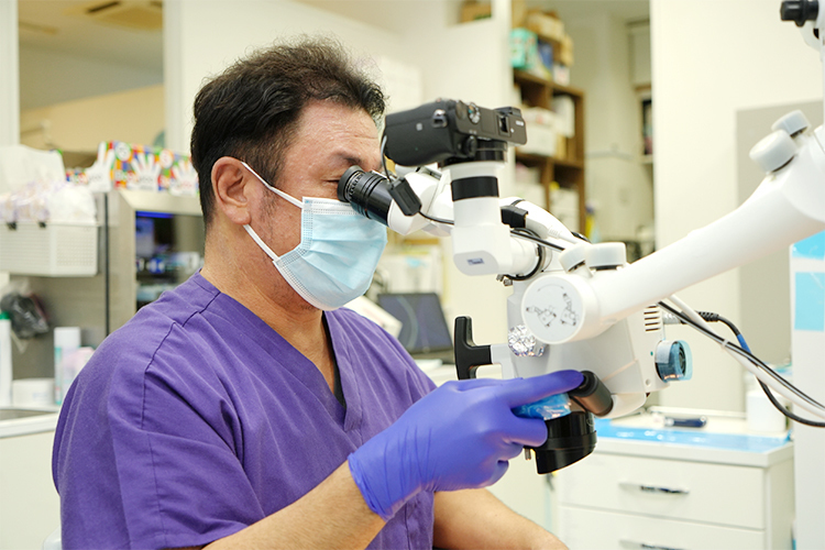 歯周病治療では歯周ポケットの奥深くに付着した歯石を除去するために、歯茎を剥離する手術をしなくてはいけないこともあります。しかし、マイクロスコープを使用すれば、患者さんにそのような負担をかけることなく、歯石を取り除けると期待できるんです。当院では歯科衛生士もマイクロスコープを駆使して処置にあたっています。肉眼では見つけられない歯茎の下に隠れた歯石を発見し、繊細な道具で除去していきます。歯本体だけではなく歯茎に関しても余計なところを取らない、触らない処置がマイクロスコープならば望めるのです。