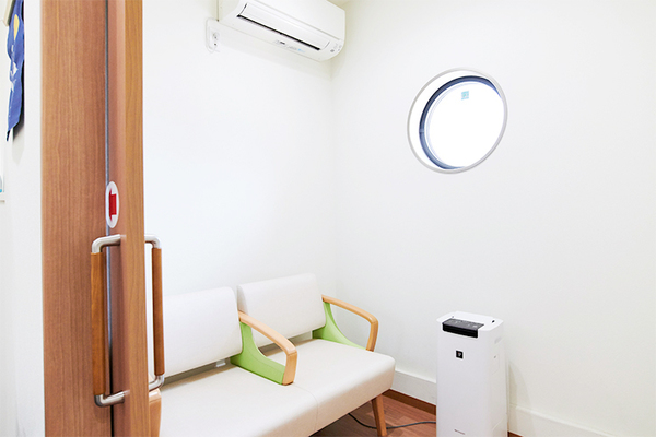 待合室をゆったりとしたスペースにし、椅子に座ったときに隣の人との距離を保てるようにしました。椅子はコの字型にするのではなく、すべて同じ方向に向けて並べることで、診察室に入る際に視線が集まらないようにしています。また、院内での感染防止のため個室の待合室も設け、咳や感染症の疑いがある場合は、そちらや処置室に案内しています。新型コロナウイルス感染症の流行後は、入り口のところにスタンド式の非接触型体温計を置き、熱のある患者さんはまず電話してもらった上で、時間帯を分けて診ています。新型コロナに関しては、インターネットに不慣れなご高齢の患者さんがワクチン接種の予約を取りやすいように、ウェブからではなく窓口で予約を受けつけるといったこともしていました。