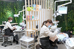 神戸駅から徒歩4分のビルにある「そうあいデンタルクリニック」は、外観、内観ともにカフェやサロンのような雰囲気が漂う歯科医院。待合室の壁一面に備えられた本棚やメンテナンスゾーンのグリーンの壁、コンサルティングルームの芝生など、それぞれの空間に「ほっ」とするような工夫を施し、患者の不安や緊張ごと温かく迎え入れる。荒木幸次院長は徳島大学を卒業後、徳島や滋賀の歯科医院での勤務を経て2015年に同院を開業。一般歯科から矯正歯科、インプラント治療まで幅広い診療で地域に浸透してきた。現在は歯科医師、歯科衛生士、歯科技工士など多くのスタッフが在籍し、専門性を持った多職種が連携しながら診療・治療にあたる。1階は診療フロア、2階は予防歯科やホワイトニングなどメンテナンス専門のフロアで、2024年には院内ラボも拡充。歯科技工士も増員し、より精密でスピーディーな補綴物の作製が可能となった。さらに型採りでは口腔内スキャナーを活用。デジタル技術の導入により従来の方法での型採りが不要になり、患者の負担も軽減している。なお口腔内スキャナーは審美歯科のほか、矯正装置の作製時にも役立っている。