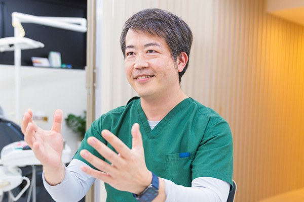 患者さんとコミュニケーションを取ってお話をすることを大事にしています。クリニックというと静かでちょっと堅いイメージがあるかと思いますが、最近の歯科は美容室のような日常生活の中のプラスの空間になりつつあります。ですので、患者さんと治療やメンテナンスの話で盛り上がるような、にぎやかな雰囲気でもいいと思うんですね。歯科診療には推理のような面白さがありますから、患者さんとの会話の中から証言を引き出して、エックス線写真などの証拠があって、ズバッと名探偵のように解決に導く。その結果、感謝していただけるとありがたく、やりがいにもつながります。また、治療には患者さんの治したいという気持ちも必要で、患者さんと歯科医師、双方が同じ思いを持つことが重要だと考えています。患者さんの治したいという気持ちがある限り、僕らは努力をしてしっかりとそれに応えていきます。