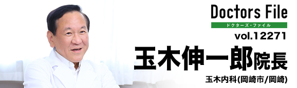 愛知県の中央に位置し、古くから宿場町や城下町として栄えた歴史をもつ岡崎市。現在も東西南北に主要道路が走る交通の要であり、市内中心部や名古屋市からのアクセスにも優れている。そんな賑わいをみせる岡崎市の南方、岡崎駅から車で7分ほどの距離に建つ「玉木内科」。1階部分をクリニックとし、地域住民に向けた親身な医療を提供している。院長の玉木伸一郎先生は、60歳を超えた現在でも日々のウォーキングを欠かさないというアクティブなドクター。診療では患者の元気を引き出すケアを心がけており、「人生の最期まで、楽しい時間を過ごしてもらうための手伝いがしたい」と力強く語ってくれた。長年の勤務医経験から見えてきためざすべき医師のありかたや、毎日の健康の秘訣まで、広く話を聞いた。