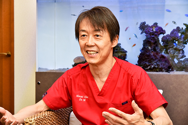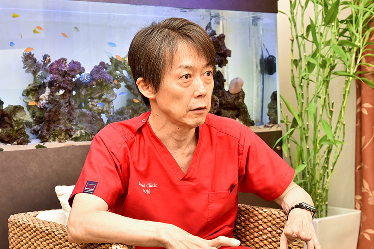 クリニックにいらっしゃる方は具合を悪くしているわけですから、体だけでなく、心も不安になっていると思うんです。だからできるだけ優しく接し、訴えに耳を傾けることを心がけています。威圧的な態度では、患者さんも心を開いてくれませんからね。何げない会話から治療方針が見えてくることもありますし、美容についての相談にだって話が広がるかもしれません。「患者本位」の診療を第一に、信頼関係の構築に努めています。また、当院は美容医療を提供しているという性質上、女性の患者さんが多くいらっしゃいます。そのため、クリニックの内装やインテリアには特にこだわりました。色とりどりの魚が泳ぐ水槽や座り心地の良いソファー、映像が流れるモニターなど、診療の待ち時間を楽しく過ごしていただくための工夫も多数あります。優しい雰囲気に安心されたのか、次回来院時にはご主人や子どもさんを連れてきてくださる方もいらっしゃいますね。