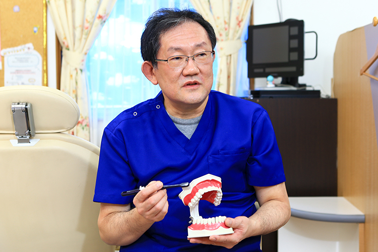 ご高齢の方が多いですね。長年住んでいる方が多い土地柄ですし、両親の代から通ってくださっています。父が昔から定期検診の重要性をきちんとお伝えしてきたので、予防の意識が根づいているのでしょう。私はそれを引き継いでいるかたちですが、ご高齢の方は比較的きちんと定期検診に来ていただいており、口腔内環境が良い方が割と多いです。また、お子さんの場合には成長により歯並びが変化していくため、より予防への取り組みが必要になります。虫歯に罹患する子は少なくなったという印象ですが、顎が小さく歯が並びきらずに歯列が乱れてきているので、正しいセルフケアが非常に重要になるでしょう。今診ているお子さんたちが高齢になっても健康な口腔環境を維持し、自分の歯で食事できるようにするのが、私の目標です。