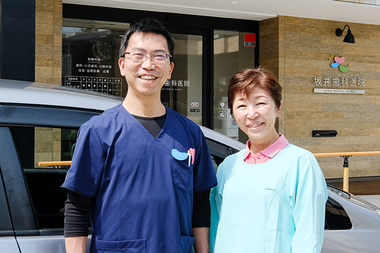 いりなか駅から歩いて約3分の場所にある「坂井歯科医院」。80歳まで歯を20本残すという「8020」運動を立ち上げた歯科医師の一人である父の想いを引き継ぎ、2008年に坂井謙介先生が院長に就任。林志穂副院長が小児歯科を中心に診療している。地域に貢献したいという信念のもと日々診療に懸命に取り組み、「患者さんを生涯にわたって診るということを大切にしています」と坂井院長と林副院長は口をそろえる。障害がある人の診療や訪問診療にも注力し、分け隔てなく診ることにも重きを置いているという2人が話す言葉の端々からは、地域の人たちへの温かい想いや歯科診療に真摯に向き合う誠実さがにじみ出ている。そんな坂井院長と林副院長に、開業からの変化や力を入れている治療、大切しているモットーなど、たっぷりと話を聞いた。