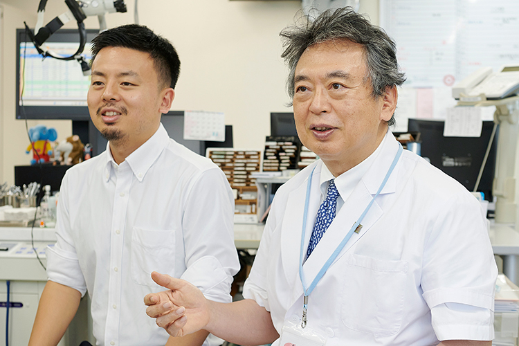 【員義院長】耳鼻咽喉科は専門性が高いところがあり、私は上気道が専門で真史先生は聴覚を専門にしています。彼が東京の大学で聴覚のグループに属し、先端の発想と技術を学んでいるので、ぜひこの鹿児島でも発揮してもらえるよう期待しています。