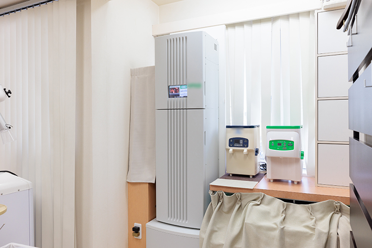 歯科クリニックはあらゆる場面で水を使っているので、水にこだわることで感染症からスタッフや患者さんを守れるのではないかと思ったのです。そこで当院では、うがい用から手洗い用、繰り返し使用する機器の洗浄用まで、すべて殺菌した水を使っています。直接目には見えない部分ですが、ユニットの中もこの水が循環しているため汚れが蓄積しにくく衛生的です。ですから、感染症などを心配されている方でも、安心して来院していただけるのではないでしょうか。ただ、水質管理は楽ではありません。機器に殺菌した水を入れっぱなしにしていると劣化が早まる恐れがあるので、毎朝出勤してから水を入れるようにしています。また、しっかりと水を殺菌できているか確かめるために、月に一度は外部に検査を依頼。検査結果は待合室に掲示しているので、気になる方はぜひ確認してみてください。