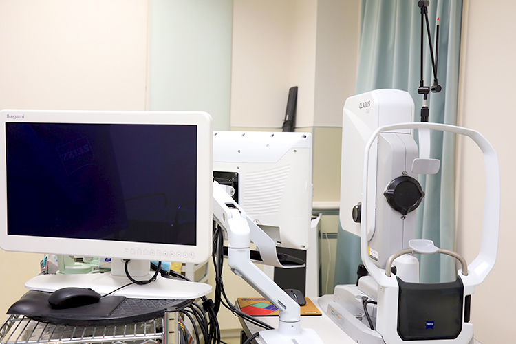 【佳明院長】検診や診断には患者さんの負担軽減のため、超広角眼底カメラや光干渉断層計(OCT)などを活用しています。超広角眼底カメラがあれば瞳孔を広げることなく、5分ほどで詳細に目の内部を確認できます。近年は前眼部を撮影するためのレンズも購入し、緑内障の診断に役立てています。新しい機種のOCTも導入し、黄斑部疾患のより詳しい診断と、鮮明な画像撮影が可能になりました。眼底カメラも多くの場合で瞳孔を開かずスピーディーに眼底網膜を撮影でき、造影剤も不要な機種です。眼底に異常が出やすい方の糖尿病網膜症や網膜剥離などの精密な検査に役立ちます。目の構造は複雑ですから、カラー写真の資料やイラストを使い、極力患者さんにわかりやすく伝える工夫をしています。