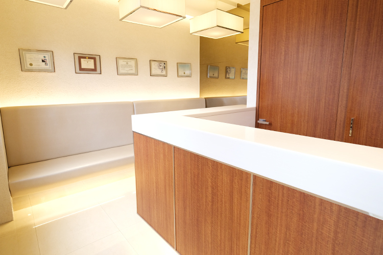 設計事務所のデザイナーさんにお願いをし、天井を高くして空間を広く取り、診療機器を使いやすくするなど、私の希望を生かした造りにしてもらいました。患者さんの中には、北海道などの遠方や大学病院からの紹介でお越しくださる方もいるので、当院に来て良かったと思ってもらえる環境や設備を整えています。トイレは男女別にして女性用はお化粧直しをしやすいような配慮をしました。また、院内には歯科技工室や研修室もあります。当院には歯科技工士が常駐しているので、入れ歯やかぶせ物の作製もスムーズに行えます。研修室では、それぞれの歯科医院で働く歯科医師や歯科技工士が数十人集まって、定期勉強会や症例検討会を行ったりしています。こちらに移転して13年ほどたちますがスタッフたちがいつもきれいに保ってくれています。なので院内は開院当時と変わらない清潔でスッキリとした雰囲気です。スタッフには感謝しています。