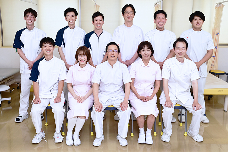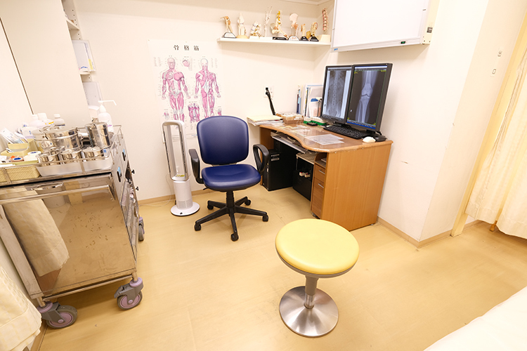 これまでの経験から、首と腰の脊椎が専門です。首・腰の痛み、手のしびれ、ひどい肩凝り、足の痛みやしびれ、などを診ます。腰椎疾患に関連して、下肢が痛くて歩けないという方もいらっしゃいます。そういう方には腰椎への硬膜外ブロック注射をすることで、痛みの緩和を図ります。ここで治療を受けることで、長年腰、足の症状でお悩みだった方が、笑顔になって帰られる姿を見ることができたら、整形外科医としてこれほどうれしいことはありません。そのためにリハビリにも力を入れています。当院には現在、理学療法士が7人と柔道整復師が5人在籍しています。理学療法士の施術は週1回くらいなのですが、効率的にリハビリを受けてもらえるような仕組みを整えています。