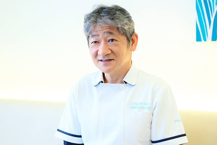 私は長らく日本医科大学の大学病院や関連病院などで消化器内科、血液内科、内分泌代謝内科の研鑽を積んできました。その後、世田谷区の地域密着型クリニックで院長を務め、訪問診療に従事したことをきっかけに、訪問診療をベースにしたクリニックを開業したいと思うようになり、2011年に総合内科と訪問診療のクリニックとして当院を開業しました。これまでの経験を生かし、「患者さんに近い場所で自分にできること」をポリシーに、日々診療しています。クリニック名の「173」は、私の名字「いなみ」が由来です。院内に施しているターコイズブルーは、ハワイの海をイメージしています。私は幼少期にハワイに住んでいたことがあり、ハワイの海の色が好きで、クリニックにも取り入れることにしました。