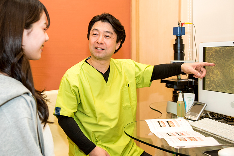 初診の場合は問診後、専用ルームでカウンセリングを行います。当院のモットーは「One to One」なので、患者さん一人ひとりの具体的な症状や、今まで受けた治療で気になった点など、お話を詳しく伺います。その後、精密な治療のために顕微鏡検査、エックス線検査、歯周病検査、口腔内の撮影などを行い、情報を集めた上で治療へ。その後、問題がなければ定期検診に移行しますが、位相差顕微鏡を使った口腔内の菌の検査は検診時も行っています。私たちも患者さんも、このようなデジタル機器を使って可視化し「菌が減った」と確認できれば安心ですよね。口腔内の菌は体内に入ると、血圧上昇や糖尿病の原因になったり、心臓に悪影響を与えたりすることもあり、放置すると危険です。全身的な健康を守ったり、体の免疫力を高める意味でも、位相差顕微鏡での菌の確認をとても重視しています。