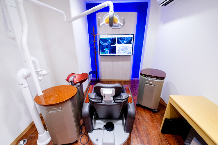 すべての人に優しくするという理念で、家族に接するように対応しています。また患者さんが望む治療を行うことが大前提ですが、できるだけ抜かない、削らないことが基本ポリシーです。そして痛くさせないこと。痛みを伴う治療の際は表面麻酔に加えて、注射器を振動させて針が刺さる痛みを軽減させるための補助装置を使用しています。歯科治療では麻酔の注射自体が痛いと思っている方も多いかもしれませんが、この補助装置によって痛みを和らげられると期待できます。麻酔の前には必ず血圧測定をしますが、高い値が出た方のために導入しているのがインディゴブルーのカラーグラス。深い藍色は、鎮静作用が望めるといわれています。緊張感を和らげて、血圧を安定させるための工夫をしているのです。高血圧や糖尿病などで麻酔のリスクがある方は、主治医の先生と連絡を取り、内科のリスクコントロールをしてから歯科の治療をするようにしています。