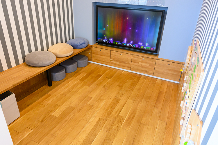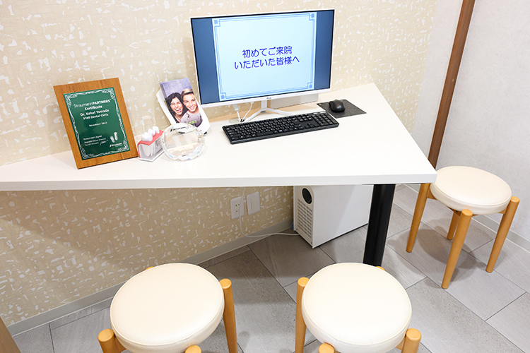 一つはキッズスペースにタッチディスプレーのキャンバスを設置して子どもたちが待ち時間を楽しく過ごせるよう工夫しています。また、待合室や診療室はどこも広いスペースを取っています。診療室は10室あり、今はまだユニットは7台ですが、いずれ増やしていく予定です。そのうち3室は完全個室になっています。カウンセリングルームも2室あり、初診時や治療計画の説明の際などに活用しています。以前のクリニックと比べるととても広くなっていますので、以前のクリニックを知る患者さんからは、同じクリニックとは思えない、などと驚きの声もいただいています。また、会計システムも改善して、保険診療、自費診療すべて電子決済ができるようにしています。