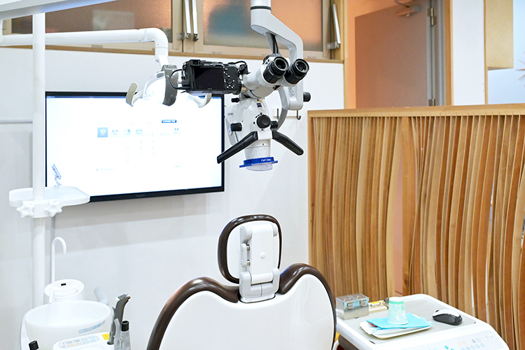 視野を最大25~30倍程度まで拡大できる歯科用マイクロスコープを2台備えています。肉眼では見えない細部まで確認できるため、精密な診断と適切な治療につながります。録画機能も搭載されており、患者さんに画像を見せながら治療が必要な理由を説明できますので、治療内容への理解を深めていただく上でも役立ちますね。さらにデジタルスキャンで型採りができる口腔内スキャナーも2台導入し、より多くの方が少ない負担で治療を受けられる環境が整いました。設備に関しては、患者さんとゆっくりお話をするためのカウンセリングルームを設けています。主に初診時や補綴の種類・材質を決めるとき、矯正やインプラント治療のカウンセリングで使用し、一人ひとりのお悩みやご希望に寄り添っています。