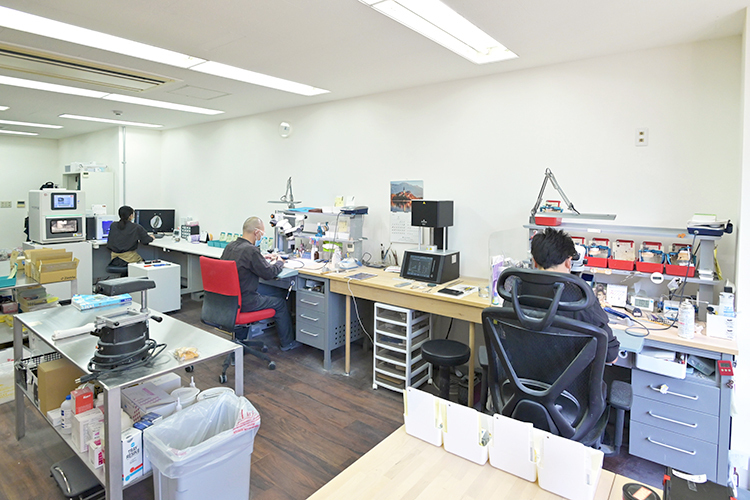 2階にあった院内ラボを5階に移転・拡充し、歯科技工士も4人に増員しました。多くの歯科医院ではセラミックなどの作製を外部の歯科技工所に依頼しますが、院内ラボならよりスピーディーに精密な補綴物を作れるのが強みです。また、質の高い治療には歯科医師のカウンセリングや設計力だけでなく、歯科技工士の腕や相互の連携体制も重要です。そのため必要な情報の共有や細かい部分の確認など、随時連携しながら治療を進めています。さらに当院では先述の口腔内スキャナーを使用し、保険診療の詰め物・かぶせ物や自由診療のセラミックのほかに矯正装置も作製しています。従来の不快感を伴う型採りは不要ですので、嘔吐反射のある方やうまく型採りができなかったお子さんも楽に治療を受けられるようになり、最近は矯正を希望される親子の患者さんが増えています。