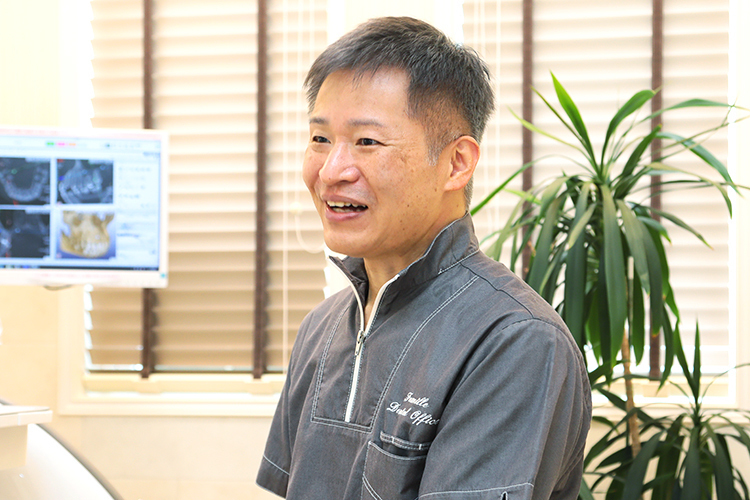 2016年に開業して以来、町のかかりつけ医として地域に溶け込めるよう努めてきました。当院の強みの一つは、歯科医師は私一人でご家族全員を担当できること。ご家族のお口を把握することで、「最近、中学生のお子さんが来ていないけれど大丈夫かな」と気にかけたり、ご家庭の生活習慣改善のアドバイスをしたりと、こまやかなサポートにつなげていきたいと考えています。長年、自分の口でおいしくご飯を食べてもらいたいと思って診療してきましたし、これからもその思いは変わりません。これからもこのエリアの方に親しんでいただき、ご家族全員で通っていただける歯科医院になれるよう努めていきますので、どんな小さなことでもご相談ください。
