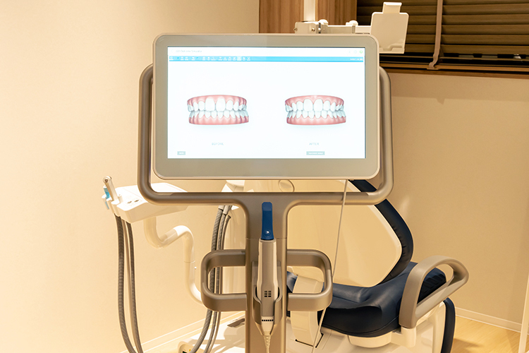 マウスピース型装置を用いた矯正にも対応しており、型採りの精度を向上させるために3D口腔内スキャナーを活用しています。従来の型採りと比べてお口の不快感が少なく、スキャンデータの送信だけでスピーディーに型ができるのが利点です。また、モニター上で口の中を立体的に確認できるので、虫歯の発見や磨きにくい場所のご説明、治療後のシミュレーションにも重宝しています。患者さんにとっても、気になる箇所について質問しやすく、ご自身の歯の現状を把握していただきやすいと思います。そして、もう一つ導入しているのが根管治療などに用いる歯科用マイクロスコープです。患部を約80倍にまで拡大できるので、痛みの原因も見つけやすく、治療精度の向上や再発による治療のやり直しを減らすのに役立っています。治療状況を画像で記録でき、その後の治療時にも生かせているんですよ。