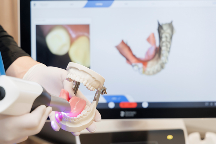 2025年2月に導入したCAD/CAMシステムは、3D口腔内カメラを使って患者さんの歯の形をスキャンし、そのデータをもとにパソコン上で詰め物やかぶせ物を設計します。従来型の型採りと違いコンピューター上で患者さんのかぶせ物を設計できるため、従来型より精度も高く、次回の治療日までの日程も短縮できるのが利点です。