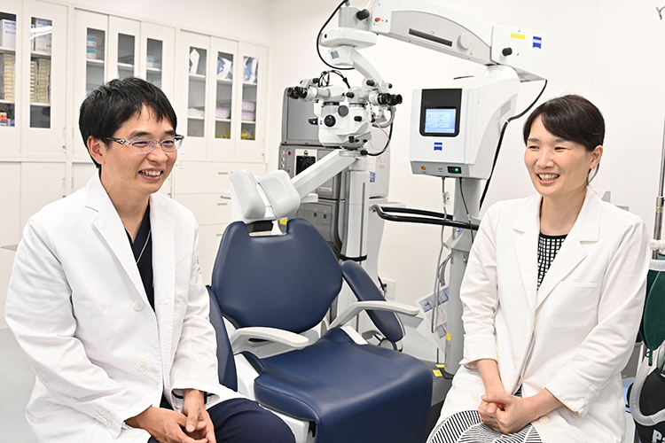 【山本副院長】2人が出会ったのは大阪大学医学部眼科学教室に入局したときです。妻のほうが1年先輩で、私の最初の指導医だったんです。彼女の専門は網膜の内科的治療ですが、その他の分野の診療レベルも高いので、私が患者であれば診てもらいたいと思いますね。私の専門についても熟知していますので、治療方針に迷ったときにも相談に乗ってもらえるのはとてもありがたいです。