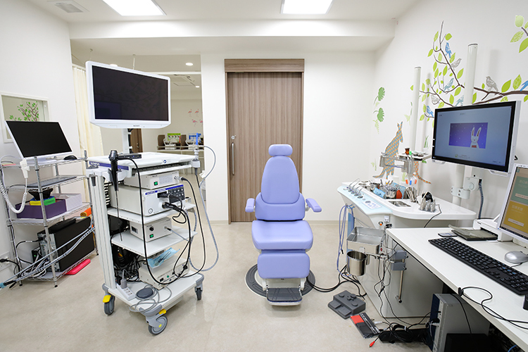 感染症対策には特に力を入れています。常時換気システムや複数の空気清浄機を備え、院内が過度に混雑しないようウェブ予約や自動精算機を導入しています。発熱の患者さんが来院された場合は、待合室とは離れた隔離室にご案内しています。また、ご家族でも安心して使えるようにトイレは空間を広くして、大人用と子ども用の便器やおむつ交換台、ベビーチェアを備えた親子トイレにしています。医療面では、専門的な診療を提供するため、リハビリ室や親子で入れる広い聴力検査室を用意しています。その他、耳鼻咽喉科用のCTや耳用硬性内視鏡、聴力検査装置、ファイバースコープ、めまい診断に使う重心動揺計、注射を使わずに指先からの微量採血でアレルギーや血液の検査が行える機器など、先進的な機器をそろえています。小児科には広めのキッズスペースを設けました。