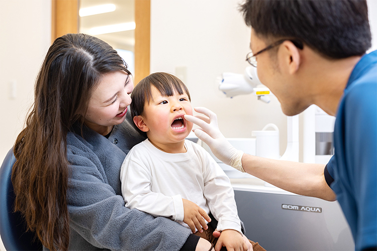 まずは歯医者さんを怖がる子の場合は膝上診療といって、お子さま向けの小さな椅子で保護者の膝とスタッフの膝を向かい合わせて子どもを寝かせます。そこで歯磨きやフッ素塗布が上手にできるようなったらレントゲンやお口の写真を撮ったり、通常の椅子に座り大人と同様の治療やクリーニングを行います。決して無理はせずに子どもの成長に合わせて治療を進めていきます。なぜなら、抑えつけて1回の治療をなんとか終えても、お子さまが歯医者嫌いになり、その後通わなくなるほうがその子の将来にとってマイナスが大きいからです。段階を踏んでできることを増やしていくことが子どもの自信につながります。お子さまが成長し上手に治療ができるようになっていく様子を温かい目で見守っていただきたいです。