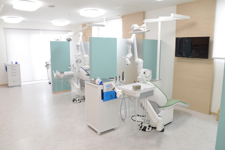 院内は木目やミントグリーンなどやわらかい色合いを基調に、リラックスできる雰囲気にしています。診療室まで入れるようバリアフリーにしていますので、車いすやベビーカーでも安心してご来院ください。空気清浄機を設置し、治療中に飛び散る粉塵などを吸い取る口腔外バキュームを各ユニットに据えつけるなど、感染対策も徹底しています。治療に使用する器具も高圧蒸気滅菌器などで都度滅菌。使用するごとに取り換えて院内感染を防いでいます。また、顎の骨の状態や血管、神経の位置などを詳細に確認し、より精密に診査診断できるよう歯科用CTを導入しています。