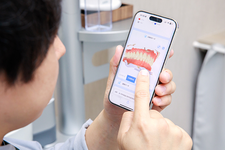 ええ。予防に注力するクリニックではよく使われている機種で、患者さんの負担が少ない形状です。スキャンのスピードが速く、精度もかなり高いことが特徴です。歯や歯茎の色、虫歯の有無、歯茎深部の腫れや出血、噛み合わせなどもクリアな3D画像で撮影できるんです。さらに、患者さんにQRコードをすぐに発行できるという大きなメリットもあります。これにより、患者さんはスマートフォンからいつでもスキャンデータを振り返ることができるんです。歯列模型のような3D画像をぐるぐると動かしたり開閉させたりしながら歯の裏側もチェックできるので、見たら驚かれると思いますよ。小さなお子さんも高い関心を示してくれるので、予防の一助になれば幸いです。
