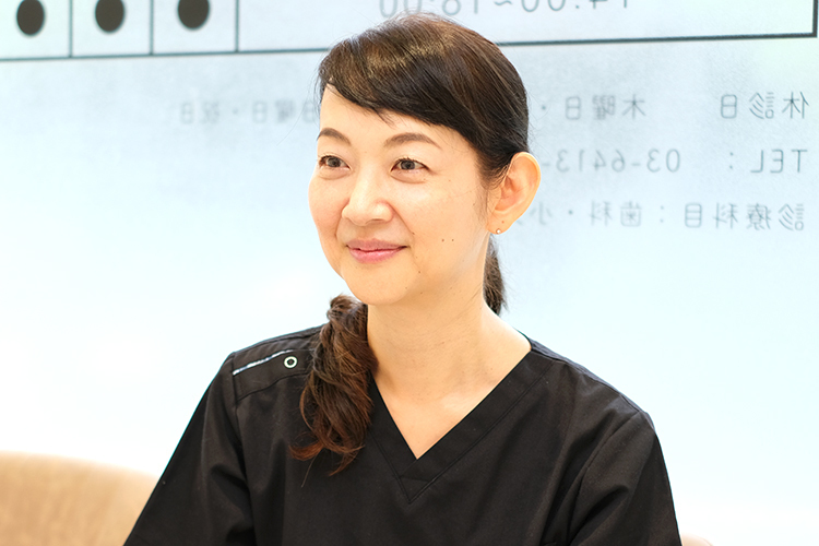 現在は歯科衛生士と歯科助手が各1~2人ずつの体制で、スタッフは、私の診療方針を理解してくれている心強い存在ですね。お昼も一緒に過ごし、一緒にいる時間が長いので自然とコミュニケーションが取れています。私としては上司というより「ママ友」のような関係で接していて、気づいたことはその場で伝えるようにしています。皆さん本当によくやってくださっていて、受付も電話対応も全員ができる体制。スタッフには患者さんへの心遣い、言葉遣いを大切にしてもらっています。すべての患者さんが気持ち良く来院できる環境づくりを心がけています。