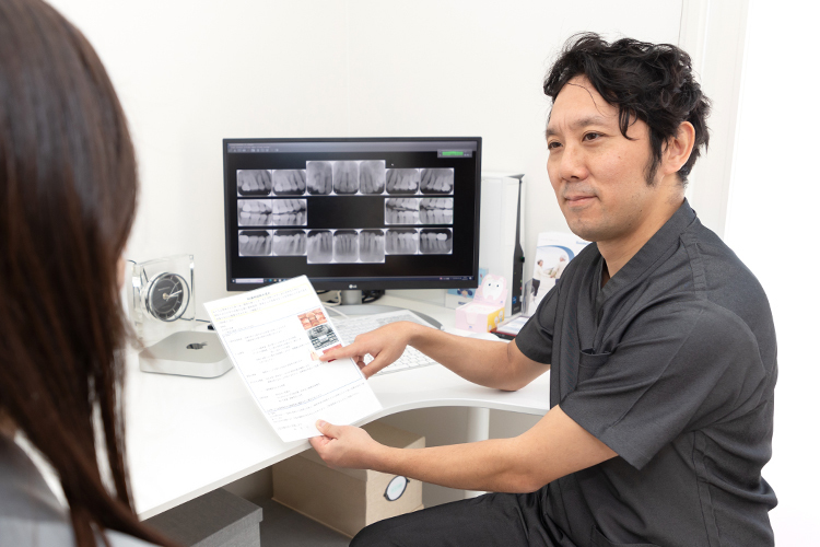 【駿院長】患者さんにご理解いただけるような丁寧な説明です。当院には40代から60代を中心に、治療だけではなくメンテナンスや予防を目的に来院される方も多く、初診時にはエックス線や歯科用CTでの撮影、口腔内写真、歯周病の精密検査などの診査診断を行います。その内容は待合室横のカウンセリングルームにて私たちから丁寧にお伝えしています。その中で治療が必要になるケースもありますが、まずはご自分のお口の状態、そしてどんな治療の選択肢があるのかなど、得られた情報はすべてお伝えし、その内容をしっかりとご理解いただくことが、治療の第一歩。今後の治療やメンテナンスを行っていくベースになるため、ユニットサイドではなく、個室で気持ちを落ち着けてお話ししたいと考えています。