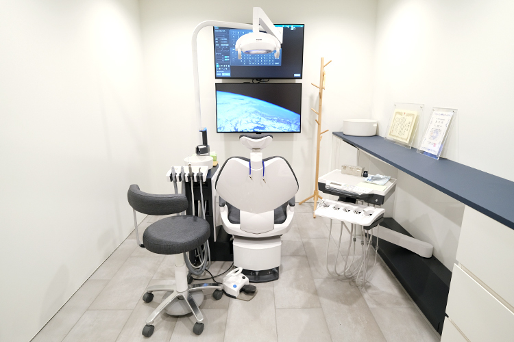 「ヒュッゲ(Hygge)」とはデンマーク発祥の言葉で、コーヒーを飲みながら読書をしたり楽しい食卓を囲んだりといった日常の些細な出来事に幸せを感じるという考え方を指すものです。好きな言葉でずっと心に留めていたので、当院で過ごす時間を日常の豊かな時間のひとこまにしていただけたらという願いを込めて院名にし、内装もその概念のとおりに居心地の良い落ち着ける空間をめざしました。ユニット3台はそれぞれ余裕を持ったスペースで、2台の仕切りや窓にはレースのカーテンを用いています。レース越しに何となく人の気配を感じる程度でプライバシーを守るとともに、窓からの日差しが優しく入るようになっています。晴れた日は、レースのカーテンに窓の外の鉄格子の模様が浮かび上がってきれいですよ。ユニット1台は親知らずの抜歯やインプラント治療など外科手術専用の個室としています。