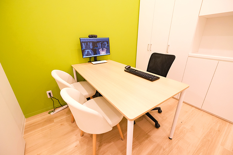 以前の勤務先が吹田だったこともあり、大阪エリアで場所を探していました。開業するなら自分が住みたいと思える場所でという思いがあり、訪ねてみて住みやすい場所だと感じたことが高槻に決めた理由です。患者さんが閉塞感を感じにくい歯科医院にしたかったので、天井を高めに設計しています。また、患者さんが気軽に受診しやすいような明るい雰囲気になるよう、白と淡いベージュをベースに、当院の前の「けやき大通り」をイメージして、優しい緑色を配しています。ケヤキは樹木の中でも寿命が長いことから、健康、長寿、幸運などの花言葉がつけられているんですよ。