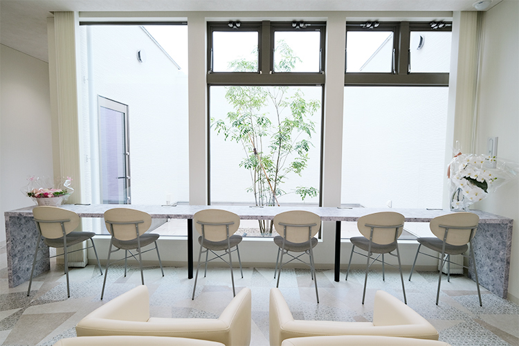 そうですね。女性専用の待合室をなるべく広々と開放的な空間にすることにまずこだわりました。待合室の椅子を背中合わせに置いているのもそのほうがプライベート空間を保てるのではと考えてです。パウダールームや授乳室を設置し、お手洗いは男女別にしていますね。待合室には外待合と中待合があるのですが、外待合には付き添いの男性やご家族も来ていただけるようにしていて、ロッカールームで着替えて中待合に入ってからは女性だけのエリアです。私以外のスタッフは全員女性で、検査は女性技師が担当します。