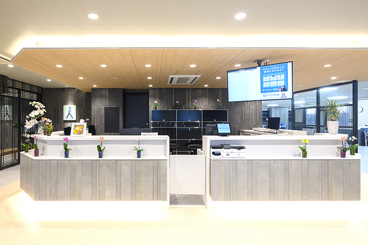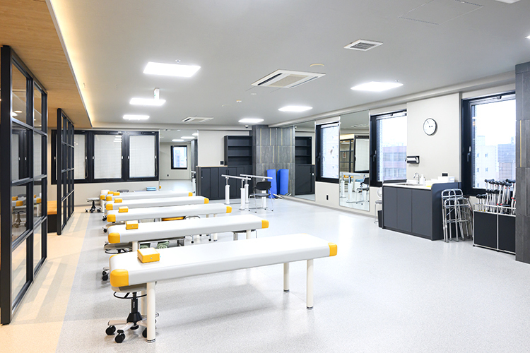 クリニックの雰囲気づくりにはこだわりました。黒を基調としたシックな色合いですが、照明で温かみのある茶色に見え、ロゴカラーの黄色をアクセントに使うことで親しみやすさも出しています。待合室は、診療を受ける前の最初の空間なので、清潔感があってゆったりとした雰囲気を大切にしています。また、リハビリテーション室は黄色をポイントで使い、清潔感と温かみのある空間にしました。整形外科という特性上、継続して通院いただく方も多いので、患者さんに「また来たい」と思ってもらえ、リラックスして治療に専念できる環境づくりを心がけています。