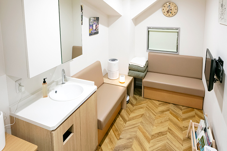 【寺師院長】麻酔の知識のある歯科医師はたくさんいますが、全身麻酔で起こり得るさまざまな事態に対応できるのは、やはり麻酔科の医師だと思います。開院に向け、麻酔科の医師にはオペ室の設計についてアドバイスを求めました。また、彼の意見を取り入れてつくったのがリカバリールームです。麻酔をして処置が終わった患者さんが1時間ほど待機する場所で、最初はプライバシーを配慮した個室を考えていましたが、むしろ誰からも見えるようにしないと患者さんの状態の変化に気づけないとアドバイスを受けました。また、吐いた物が喉に詰まることがないよう、寝かせずに座らせることが大事だと。それらの助言を反映し、見通しの良い空間にベンチを置いたリカバリールームが完成しました。
