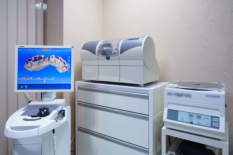 義歯、クラウン、ブリッジですね。また、歯科用のCAD/CAMシステムなどの機器を導入していますので、かぶせ物などに使用する修復物などをデジタルで作成できます。カメラで動画を撮ってそこから型を作ることができるので、従来のような型採りや模型を作る作業がありません。手作業によるテクニカルエラーの防止にもつながりますし、型を採るのが苦手な方や嘔吐反射が強い方に対しても有用だと考えています。当院ではデジタル技術を生かした歯科治療に力を入れていますが、これにより、治療の精密さの向上をめざすだけでなく、診療時間が長引くことによって増える患者さんのストレス軽減につなげ、「患者さんとのコミュニケーション」の時間が取りやすくなると考えています。院内には、長らく一緒に仕事をしている歯科技工士もおり、あうんの呼吸で対応してもらっています。