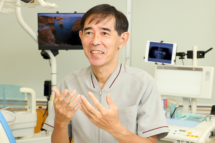 患者さんの最終的な目的は、入れ歯を入れることでもなければ、噛めるようになることでもありません。おいしく物を食べて幸せに生活をすることでしょう。ですから、その患者さんにとって幸せとは何かを話し合って、そこに向けて一緒に歩んでいくことが大切だと考えています。治療が必要な場合には、対応できるように引き出しをたくさん用意しているつもりです。それに、患者さんの生活習慣とストレスの管理も大切で、噛めるように治療すれば良いわけではないのです。虫歯も歯周病も感染症であるだけでなく生活習慣に影響を受けるものですから、それを改善せずに治療しても、それは根本的な解決にはなりません。しっかりと噛める治療をするのは当然のことで、加えて生活習慣を見直してもらい、ストレスの対処方法を一緒に探っていくことが大切なのです。