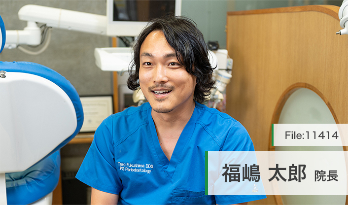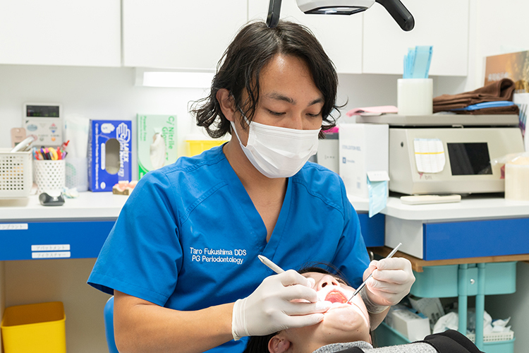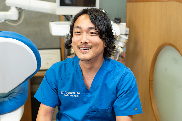 多摩市永山にある「福嶋歯科医院」は、歯周病治療に力を入れているクリニックだ。院長の福嶋太郎先生は、日本歯周病学会認定の歯周病専門医の資格を持ち、歯周病治療に情熱を傾ける歯科医師。2019年にはもっと知識を得たいとアメリカに留学。先進の歯周病治療について学び、その経験を現在のクリニックの診療に生かしている。一般のクリニックで処置が難しい歯茎を切開しての歯周ポケットの掃除や、骨の再生療法などにも対応。高い専門性を持つ歯科医師だが、その素顔は穏やかでとても話しやすい。順序立てた丁寧な説明も得意とし、患者の不安解消に努めている。そんな院長に診療の柱である歯周病のことや今後の展望などを聞いた。