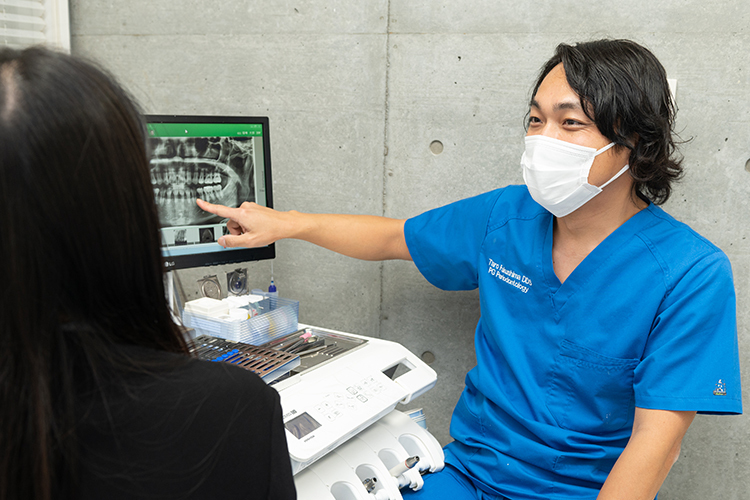 歯周病はとても複雑な病気で、歯科医師でも理解しきれていない人がいるくらいですので、患者さんには物語のようにわかりやすく伝えるように努めています。また、歯周病は重度だと歯が抜けているケースも多く、歯周補綴が必要になります。治療した後の状態が長く続くように、より安定した補綴を提供できるように取り組んでいます。治療後は3ヵ月に1回のメンテナンスも大事です。3ヵ月という期間にも理由があり、歯の汚れはだいたい100日くらいでまた同じ大きさになるため、そうなる前にケアしたいからです。研究でも4ヵ月以上開けてランダムに来ていた人と、3ヵ月ペースで来ていた人とでは、その後の状態にはっきりと差が出ています。長い治療になりますし、メンテナンスもずっと続きますから、居心地の良い院内づくりも大切だと考えています。当院は若いスタッフが多いのですが、素直な人が多くていい雰囲気がつくれていると思います。