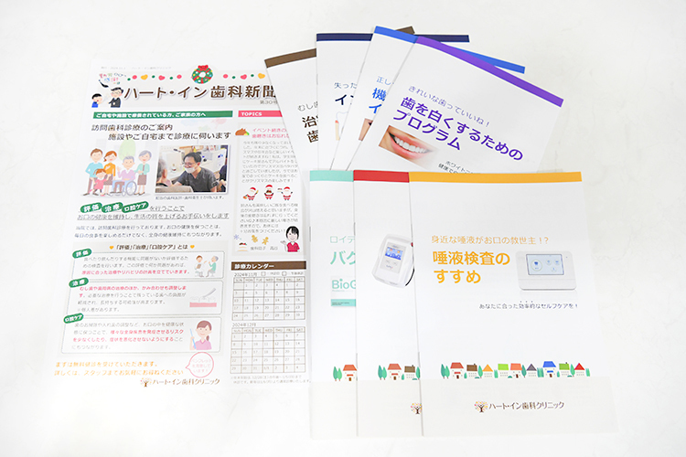 歯周病の検査・唾液検査・顕微鏡検査・CTで撮影した写真など、患者さんの検査データや情報はスタッフにも共有しながら治療を進めるようにしています。患者さんはそれぞれにリスクも違えば、生活習慣にも違いがあります。その違いをスタッフみんなで理解しながら、うまく治療とサポートができるように心がけています。最近では、患者さんにクリニックの考えや治療方法をより良く理解していただくために、オリジナルの“小冊子”を作成しています。そして、クリニックのトピックスやスタッフのことなどを知っていただくために“ハート・イン新聞”を2ヵ月おきに発行しています。小冊子はご自宅でじっくり読むことができ、理解しやすいと好評で、新聞は歯科の豆知識やスタッフのコメントなどあり、楽しみにしてくれている方もいらっしゃいます。