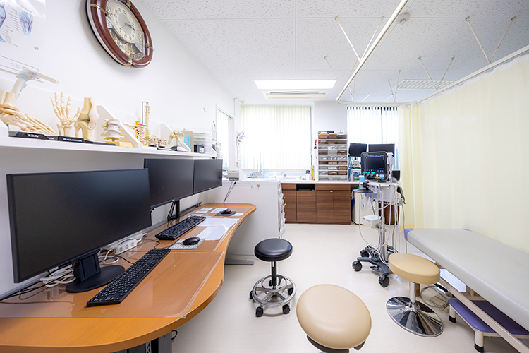 整形外科の疾患というのは、お子さんから高齢の方まで全世代に起こり得るものです。成人の方の骨折後のリハビリ、腰痛や膝の痛み、膝関節の他に、さらに小中学生のお子さんのスポーツ障害では、リハビリに力を注いでいます。木曜日・土曜日以外は19時までやっていますので、夕方以降に利用してくださるお子さんも多いです。また、お子さんのスポーツ障害は早期発見、早期治療が重要です。肘肩などの関節の痛みは超音波検査を用いて診断し、全身の柔軟性も確認しています。痛みが強くない方でもよく診察すると体が硬かったりどこかに異常がある場合がありますからね。早い段階で予防のストレッチや指導をしたりして体をやわらかくしていけば、短期間でスポーツに復帰もめざせます。
