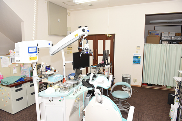 元はオルゴールのショールームとして造られた建物で、十分な広さがあるので、待合室、診療のためのスペースにもゆとりを持たせることができました。当初、院内はスリッパに履き替えていただいていたのですが、衛生面が気になるという声もあり、靴を脱いでそのまま上がってもらえるように抗菌カーペットを敷いています。リノリウムの床材のような冷たさがないので患者さんにも好評で、寝そべって本を読んだり、テレビを見たり、広さがあるので走り回ったりするお子さんもいます。カーペットは月に一度、専門の業者が徹底してクリーニングして清潔に保っています。