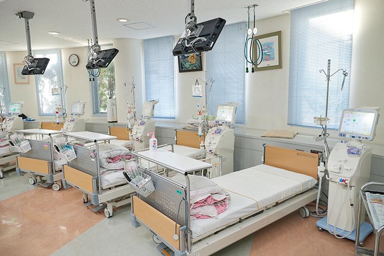 【川原院長】血液透析室では患者さんの治療状況をリアルタイムで共有できる透析通信システムを導入しています。また松本先生による在宅で行う腹膜透析に力を注いでいます。前立腺肥大症の治療においては、高エネルギーのレーザーを用いて前立腺を内側から蒸発させるためにCVP(接触式レーザー前立腺蒸散術)を導入しています。切除と止血を同時に行うため出血リスクが低く、複数の薬を内服している方などにも行える手術です。尿管結石に関しては先進のレーザーを導入し、砕石効率が上がることが望め、手術時間も従来より短縮を図れるのも特徴の一つです。また当院では前立腺がんに対して陽子線治療を行っているメディポリス国際陽子線治療センターと連携をしており、職員さんに毎週金曜日に来ていただいているため治療相談が可能です。